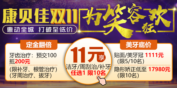 一年一度的双11即将来临,购牙美牙也疯狂! 牙齿不仅是身份的象征,亮丽的牙齿更是妆容的最佳点睛之笔。双11专属优惠,助攻自信迷人微笑!近期有需要的朋友们可以关注大连康贝佳官方网站,无论是优惠项目还是折扣力度都物超所值!